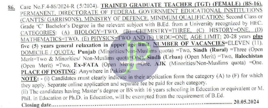 If you have completed your education in the following subjects then you are eligible to apply online for TGT Jobs 2024 through the Federal Public Service Commission.