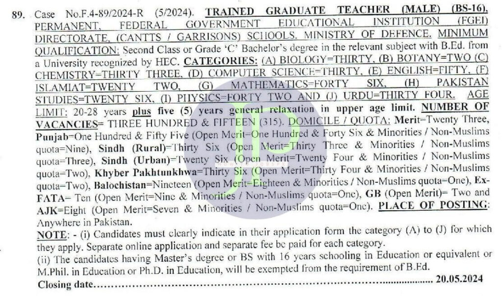 Federal Public Commission announced its consolidated advertisement No. 05/2024 today for FPSC Trained Graduate Teachers TGT Jobs 2024 for both males and females. An online application form is available at www.fpsc.gov.pk for government jobs in Pakistan. Candidates from KPK, Punjab, Sindh, and Baluchistan may apply online for these jobs permanently.
